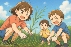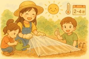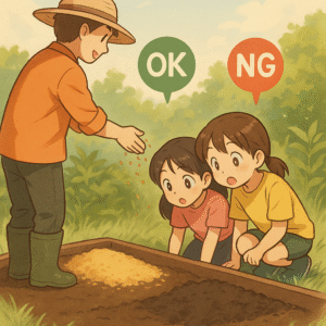 - コツ:風で飛びやすい→水で軽く湿らすか上から少量の刈草で押さえる